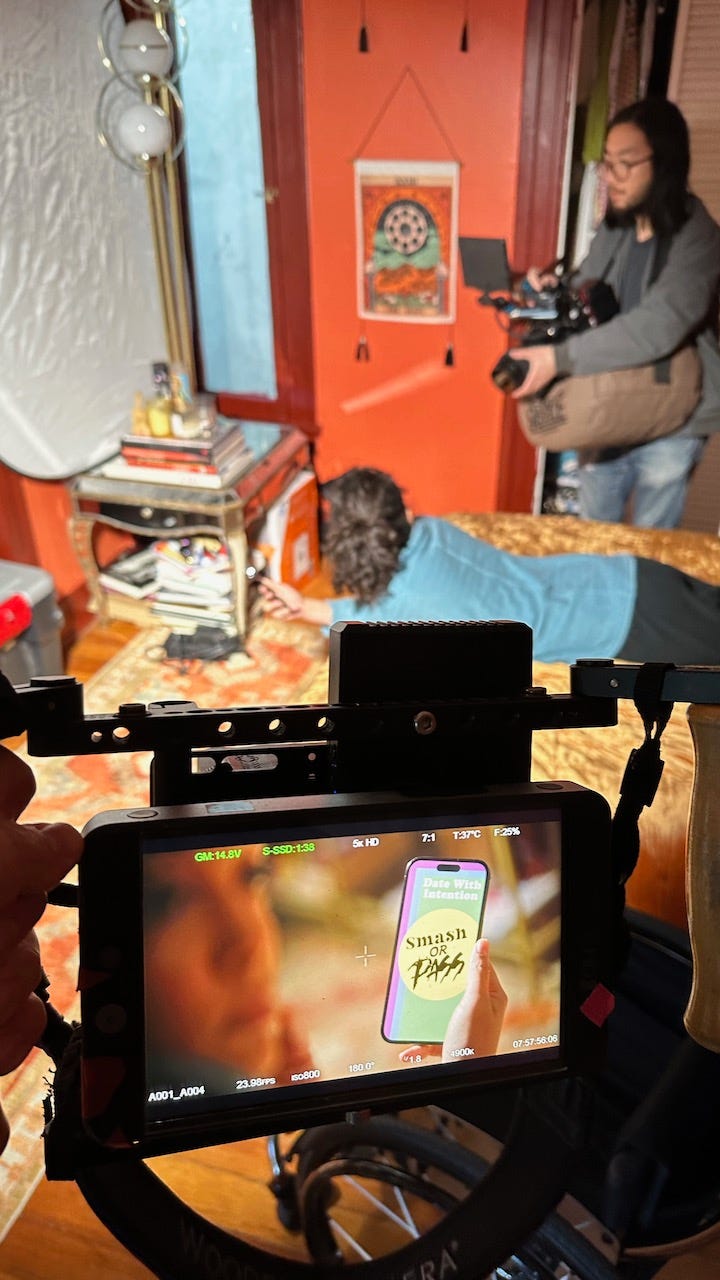 Every film must be light on its feet as changes come. The camera slate in the photo below shows the original title of the film: Dessert. Once I got into the edit, I mulled over themes and decided not only is Smash or Pass more evocative, but it better serves the dating app and editing style we designed for the film. So Dessert was out and Smash or Pass was in.